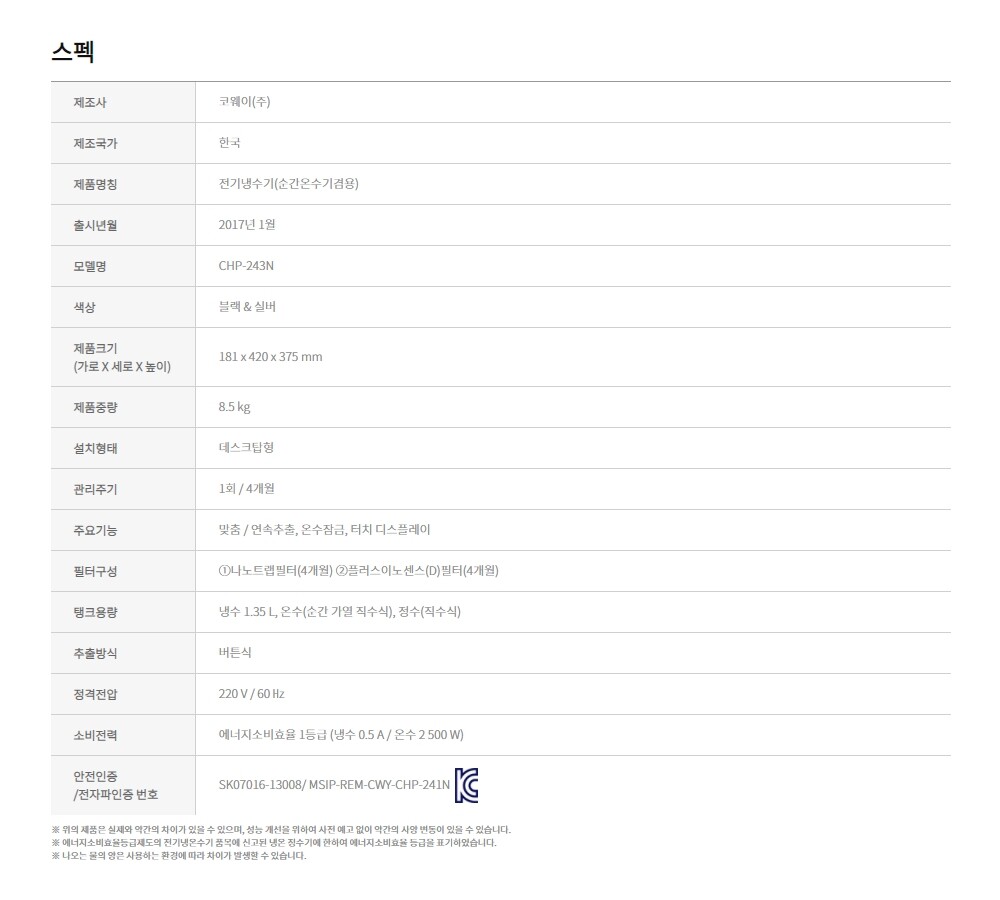 CHP-243N 코웨이 한뼘 블랙 냉온정수기 *월