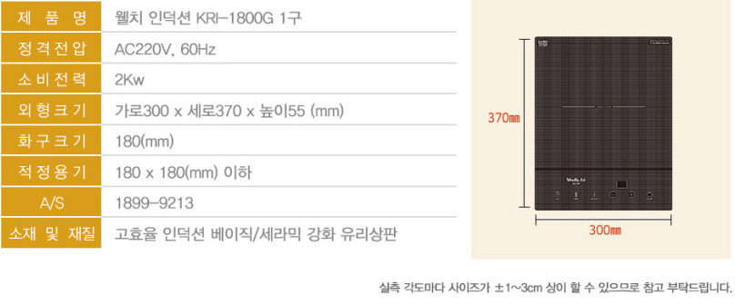 웰치 인덕션 1구 테이블 매립형 구이용 업소용 인덕션 KRI-1800G