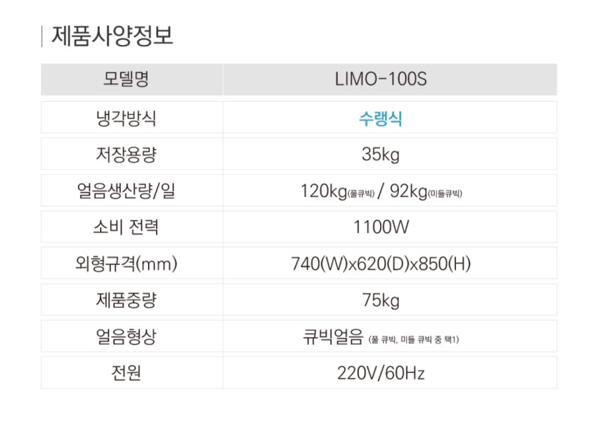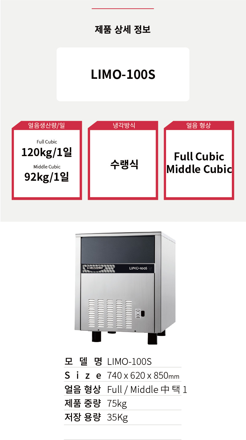 라셀르 [LIMO-100S] 얼음 생산량 120kg/일 업소용. 영업용. 카페용. 제빙기. 큐빅얼음. 수랭식.